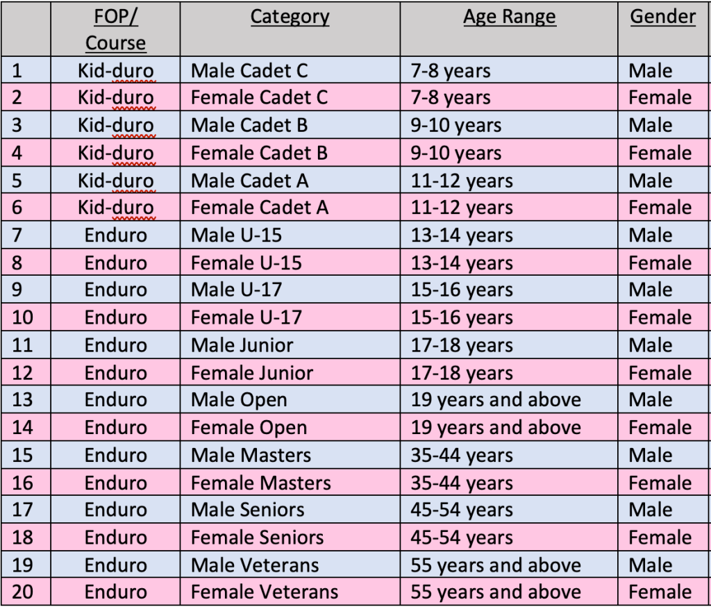 Singapore Open Enduro 2025 is sanctioned by the Singapore Cycling Federation (SCF). It is classified as a SCF Class 3.1 Mountain Bike (MTB) Enduro (END) event, and racers contesting the Enduro Course are eligible to receive points for the 2025 SCF Points Series (MTB) based on Event overall ranking (1st-10th place), as well as each Race Stage (1st-5th place; Prologue Stage not included) – according to their SCF licensed age group for MTB END events. Do refer to the table below to work out which Age Category you should enter for the event.
